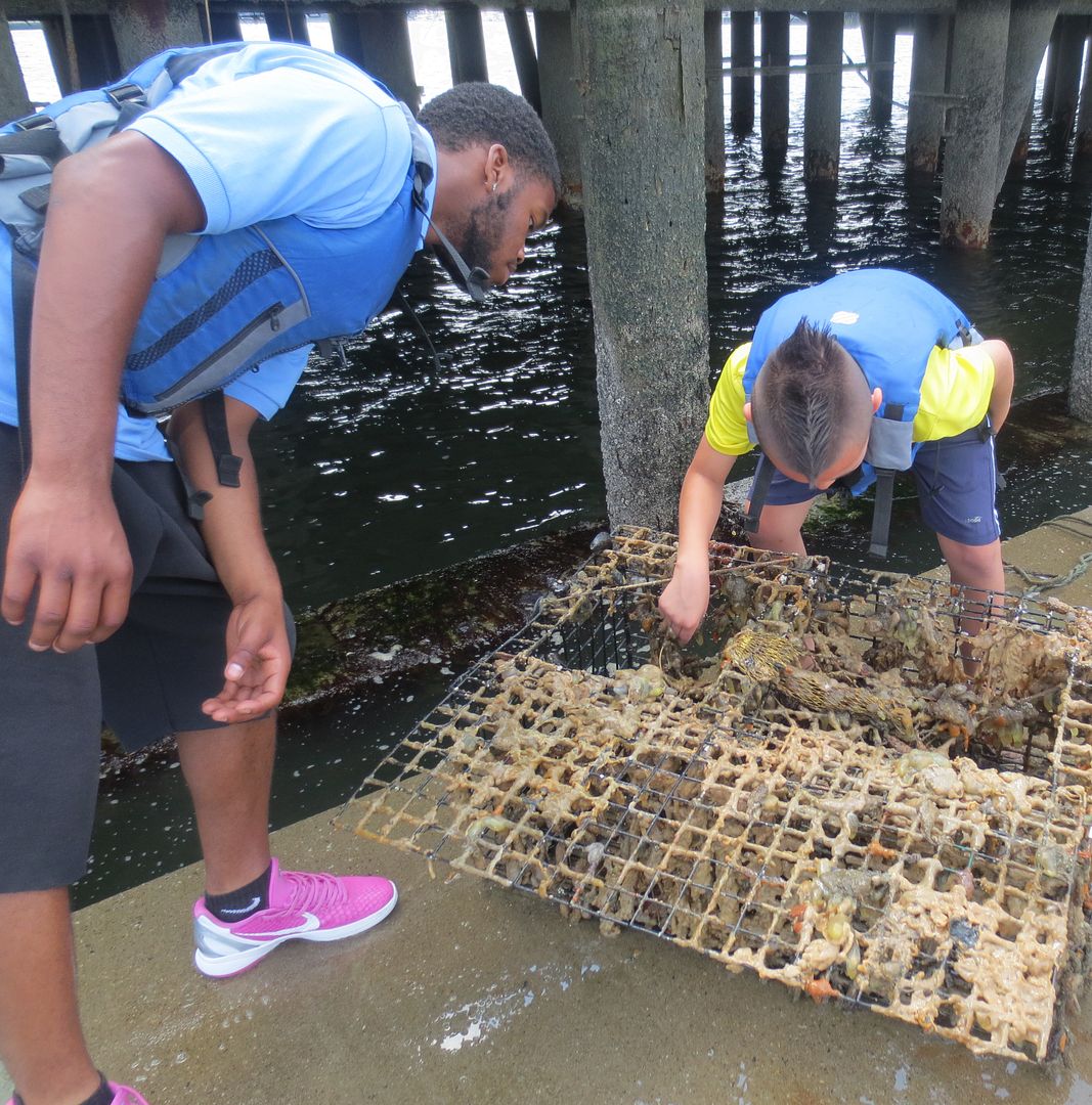 Pulling up lobster traps at the Courageous Sailing Center in Charlestown has been a blast! We have caught some amazing creatures in these traps. We have caught crabs, fish, jelly fish and we even caught a lobster. this kid was so happy that he found a crab in the lobster trap, but he was also afraid of the crab. Although he loved catching the crab, he didn't like the "slimy" stuff that formed on the outside of the trap. That "slimy" stuff on the traps are called tunicates, also know as sea squirts. They usually form colonies on the underside of docks, boats and rocks. I guess you really do learn something new everyday.