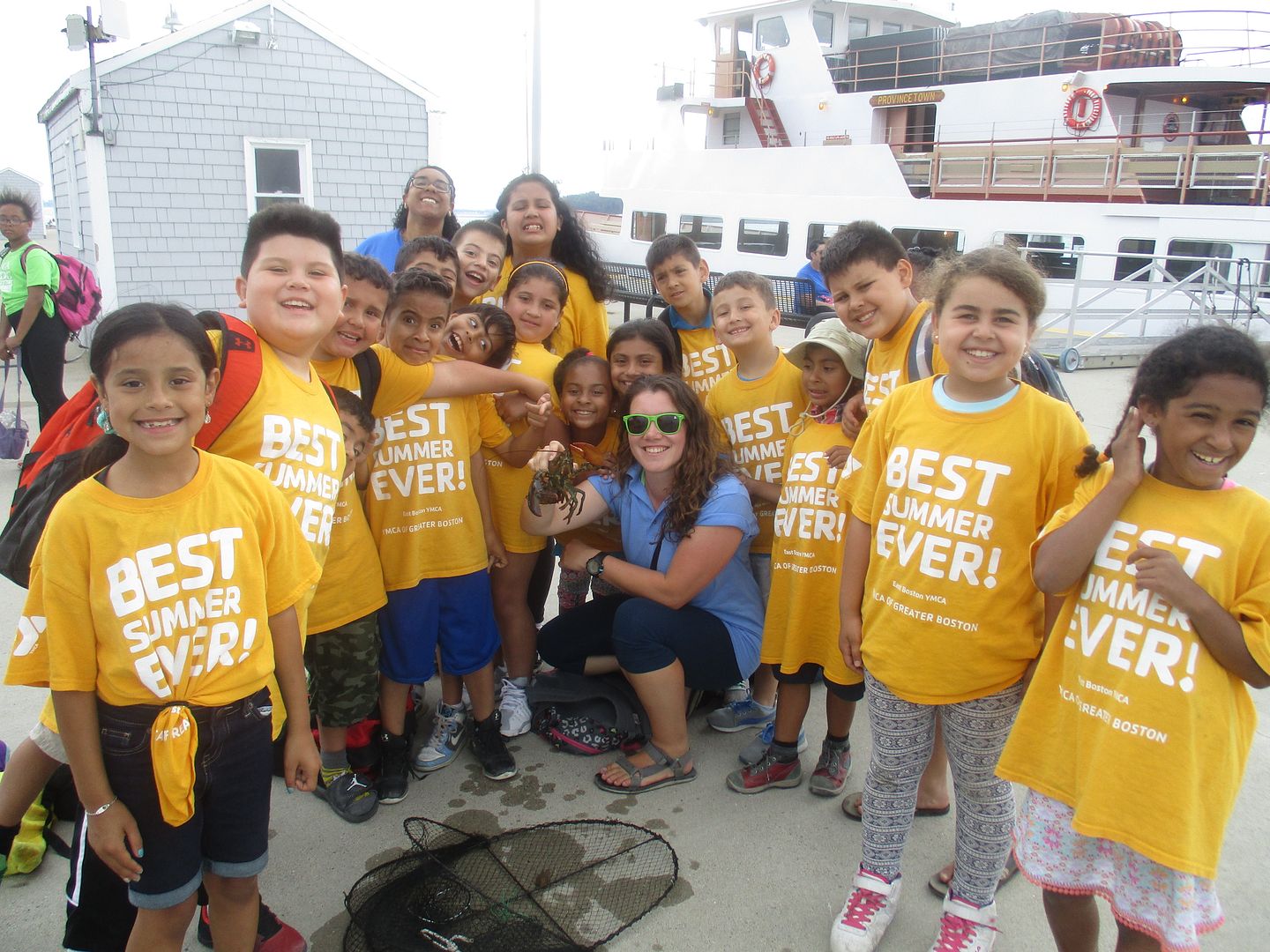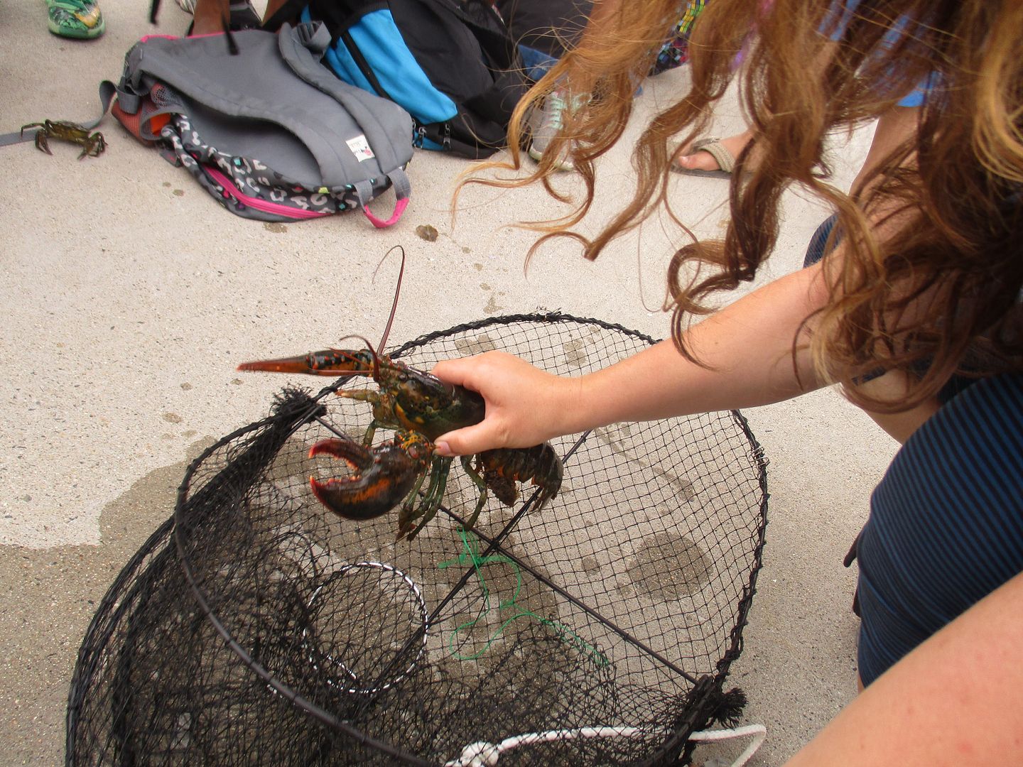 On our last day at Spectacle we had a surprise visitor in one of our crab traps. As I was pulling up the trap for one of the last groups of the day, I excitedly exclaimed that we had caught a lobster!! Our excitement spilled over to all the kids on the pier when they saw what we had in our trap. It was a welcome change to all the crabs we had been catching all day. Everyone crowded around to get to touch and take a picture with the lobster. Kharliyah did an excellent job balancing the crowd and holding the lobster at the same time!