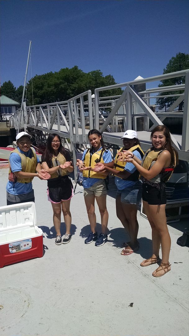 Today was a pretty interesting day at Piers Park. While some kids were on the dock catching crabs or fishing, others were taken out on kayaks. I stayed upon the dock with the kids that wanted to pull up the crab traps. All of a sudden, from a far I hear kids yelling "we got a jellyfish, we got a jellyfish." I got up and made my way to the edge of the dock. It was a moon jelly. I took the moon jelly and put it in its own little touch tank. The kids were so fascinated and curious. They asked questions like, "Can't jellyfish sting you?" "How do you know if it is a girl or boy?" and "How do they eat?" I was glad to answer their questions, even though for some of the questions; google was my helper. Roughly 15 minutes later, I peeped Sean going into the water and I was wondering what he was doing. Turns out that Paula and him found some starfish. Never before while I have been working with Save the Harbor have we had a starfish or even two in a touch tank. We got two moon jellies and two starfish. Excited to see what else this summer has planned for me.