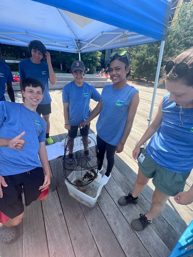 The Children's Museum group had a very exciting week 3. Or rather, we had a very exciting Thursday which more than made up for the slow days we had for the rest of the week. Due to the heat wave, we found that not a lot of people wanted to stand outside in the sun and fish. Usually we're able to draw a decent crowd to look at and hold crabs from our touch tank, but on Tuesday we were only able to pull up a single crab and on Wednesday we got nothing at all. When we came into work on Thursday, we thought we were looking at another crabless day. But then, one of our campers dropped her fishing line right onto our old crab trap, one that had somehow fallen off of its rope over a week earlier. We reeled it up and discovered 8 green crabs, all alive and well. After that, almost everybody passing by wanted to visit our tent (a.k.a. Aiden's Crab Emporium, with deals you can't refuse).